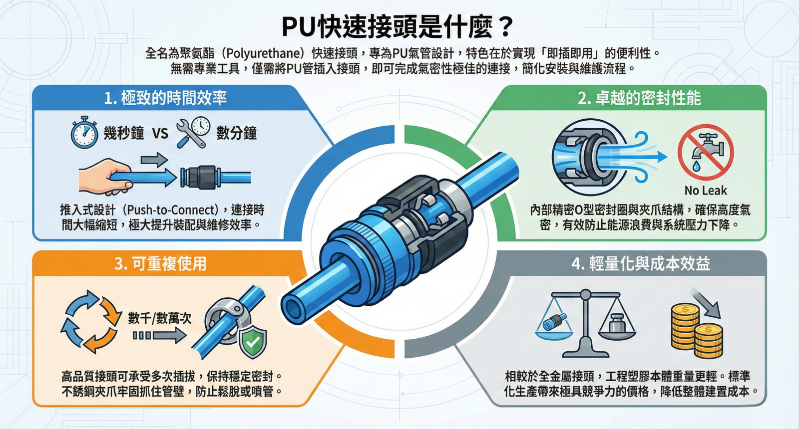 PU快速接頭,全名為聚氨酯 (Polyurethane) 快速接頭,是專為PU氣管設計的連接元件,特色在於實現「即插即用」的便利性,操作者無需任何專業工具,僅需將PU管插入接頭,即可完成氣密性極佳的連接,大幅簡化了安裝與維護流程,PU快速接特點包含以下: