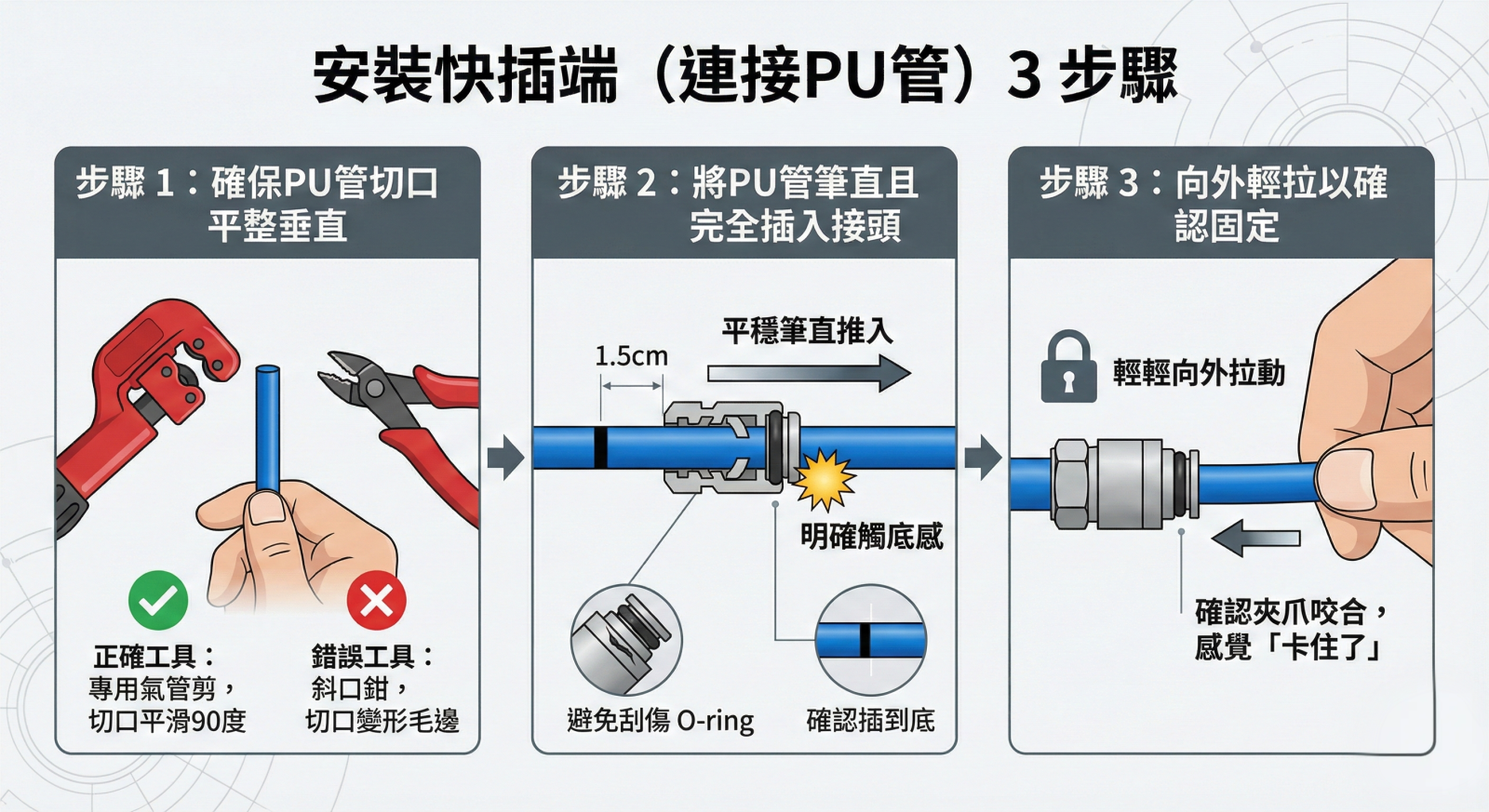正確的安裝程序是預防PU快速接頭漏氣最有效的方法,整個過程可分為「快插端安裝」與「螺牙端安裝」兩大部分。
