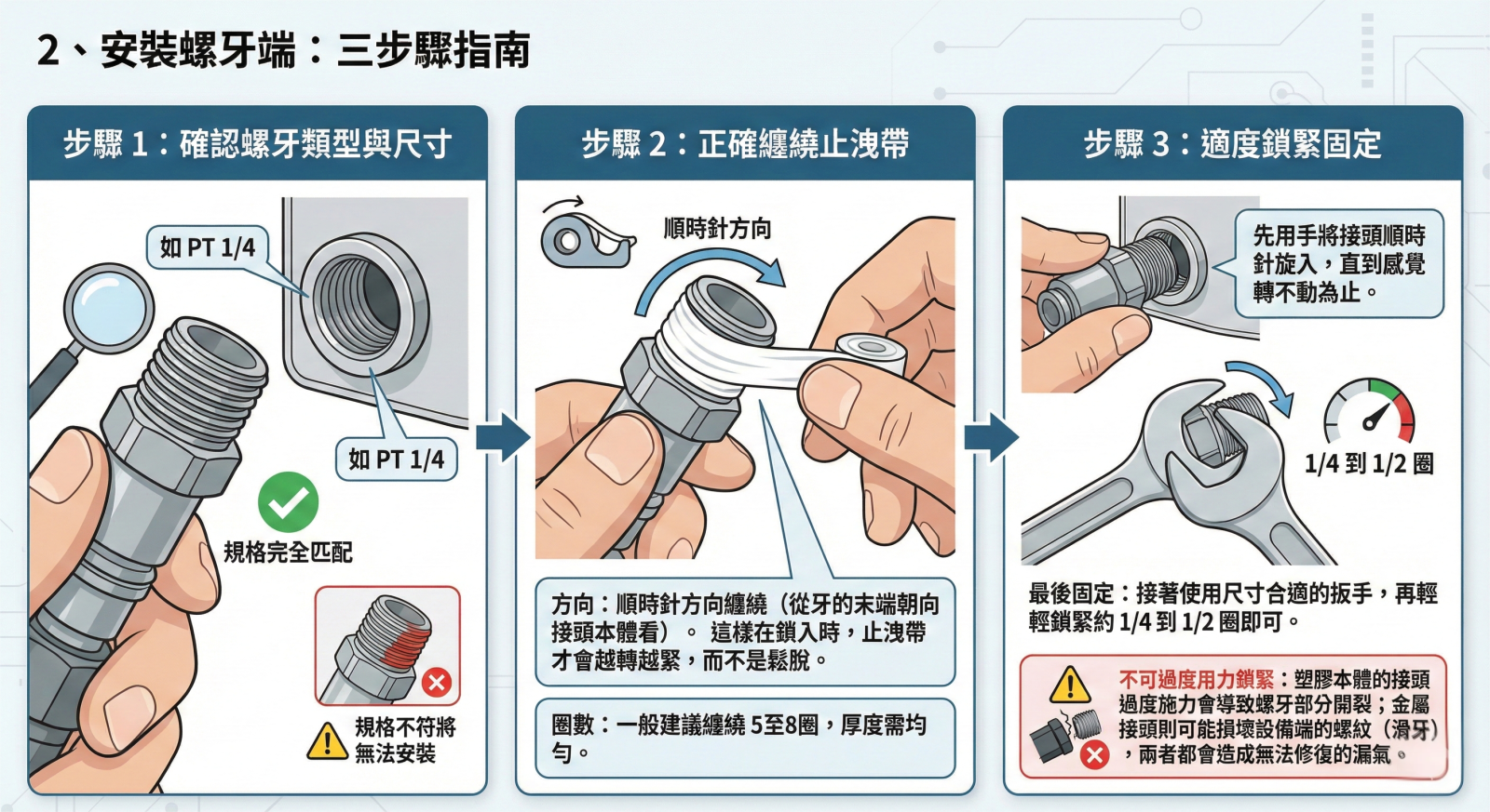 再次確認接頭的螺牙規格 (如PT 1/4) 與設備端的牙孔規格完全匹配。規格不符將無法安裝。