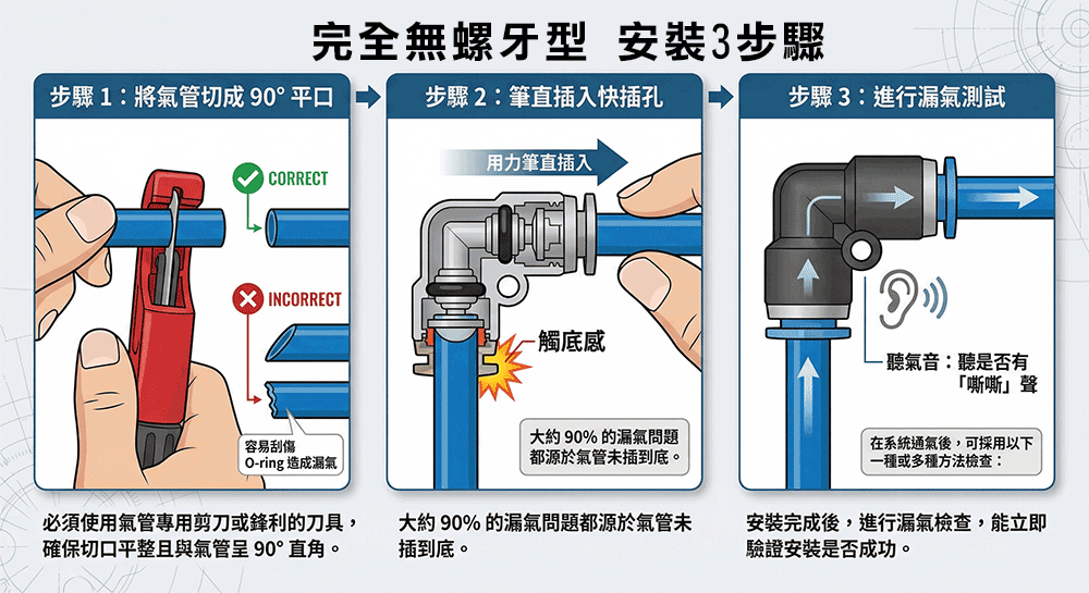 將氣管筆直地、用力地插入快插孔,直到感覺到明確的「觸底感」。大約 90% 的漏氣問題都源於氣管未插到底。