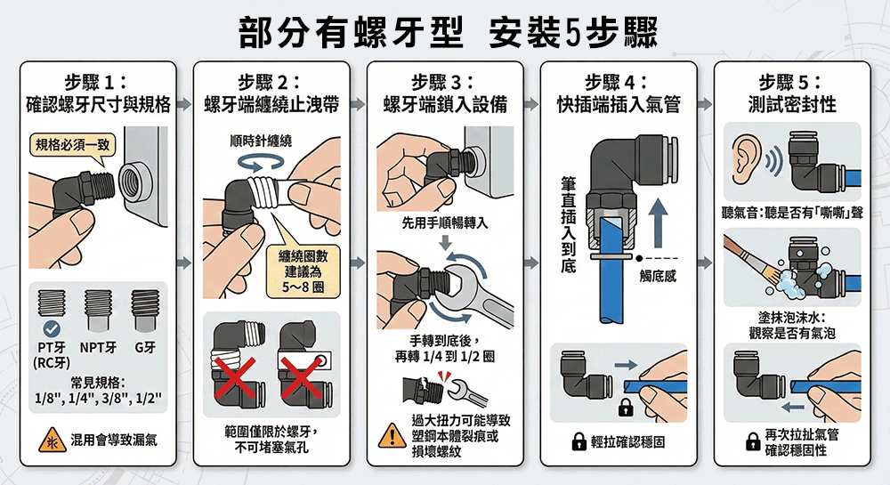2. 部分有螺牙型 (一端螺牙+其他端快插) 安裝步驟